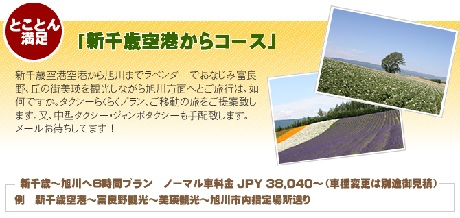 新千歳空港にお迎え、お帰りは各空港へお送り、自由な旅らくらく北海道タクシー旅行プラン このページは、今話題の旭川中心に新千歳空港をスタートして北海道観光を提案する宿泊コースを御紹介致します